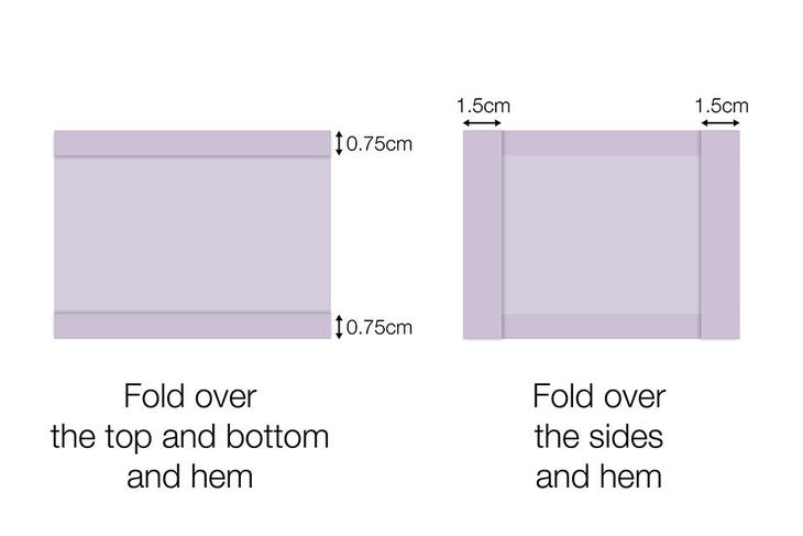 ▲ 2枚の生地を重ね合わせて、左図のように上下の裾を0.75cm幅で折り、右図のように両側を1.5cm以上、折りたたむ(折りたたみ幅は顔の大きさに合わせて調整)。左右の端は紐が通せるようにしたまま、折りたたんだ部分だけを縫い合わせる