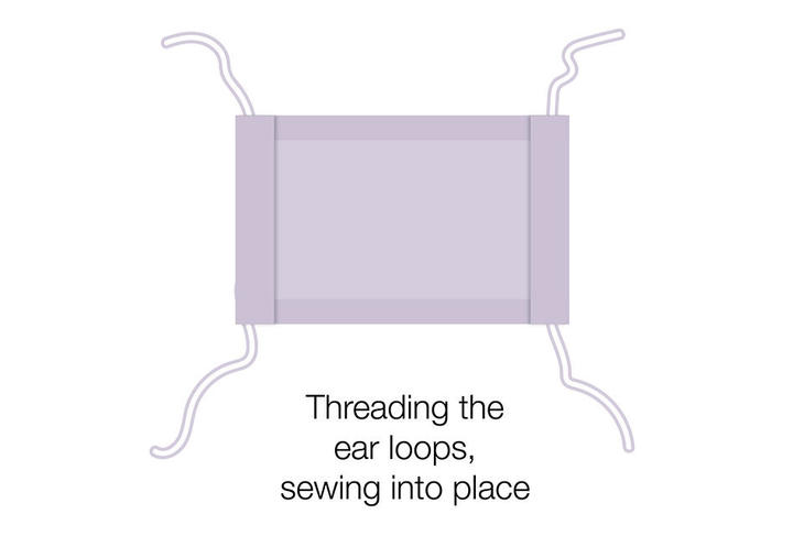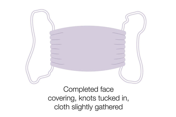 ▲ 手作りマスクの完成図。紐の結び目は裾の内側に入れ込み、マスクの両端は顔にフィットするようギャザーをつけて着用
