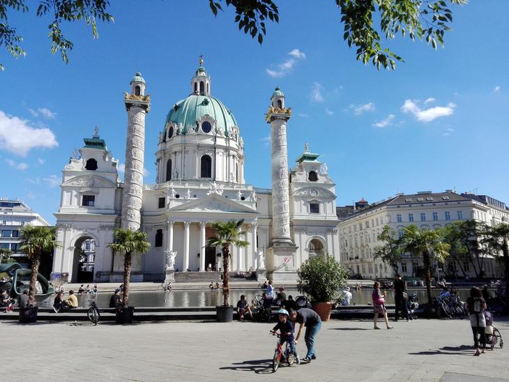 少しでも天気がよくなるとすぐさま外に出るのがオーストリア人のさが。服装も一転してサマースタイルになり、町もにぎやかになってきました。今回は、ちょっとした散歩にも休憩の場としてもウィーン市民に愛される憩いの場、Karlskirche(カールスキルヒェ)カールス教会前の広場を紹介します。