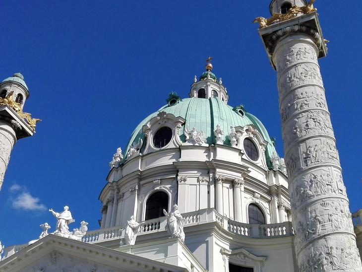 見ごとな円頂と巨大な円柱が目印の荘厳なバロック建築、カールス教会。ウィーン市内のどこからでもアクセスがよく、特に観光名所の集中する1区からは歩いて立ち寄れるため、人気スポットです。