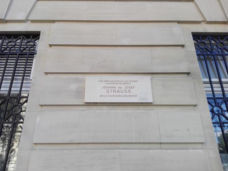 ウィーン工科大学の外壁には、オーストリアの偉大な作曲家、ヨハンとヨセフのシュトラウス兄弟がかつてこの場所にあった学校で学んだと記された石碑が見られます。