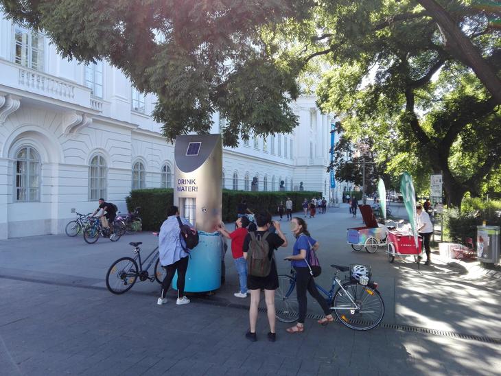 カールス教会の横にはウィーン工科大学があり、広場は学生たちの憩いの場にもなっています。ここは、ランナーや、観光の途中にペットボトルに水をくみに来る人が列をつくる大学前の水飲み場。