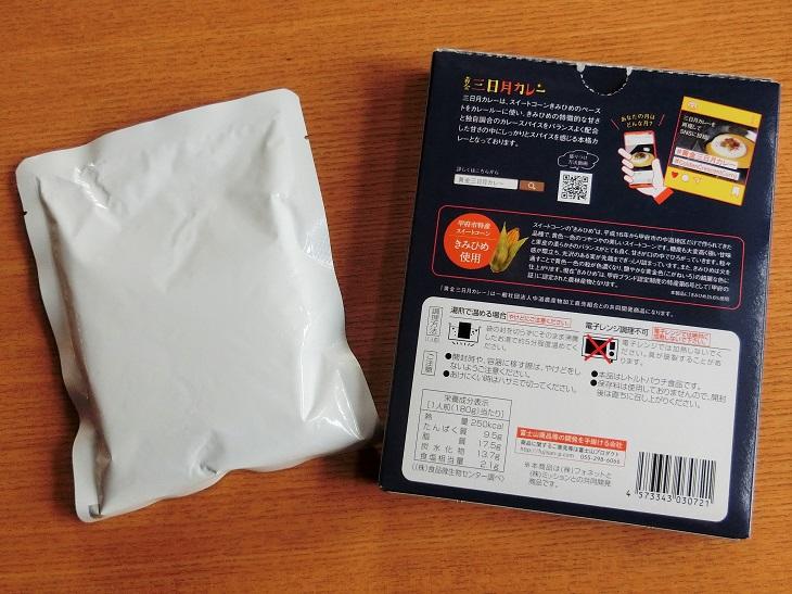 「黄金(こがね)三日月カレー」(税込み655円)は、普通に温めてご飯にかけるだけ……ですが、盛りつけに工夫すると、フォトジェニックな写真が撮れるんです。こちらはトウモロコシがはじけることがあるので、電子レンジは不可だそうです。
