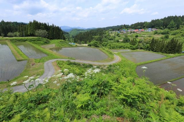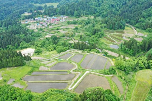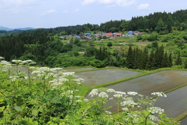 上部に位置する水田脇より、棚田の先に集落を望みます。