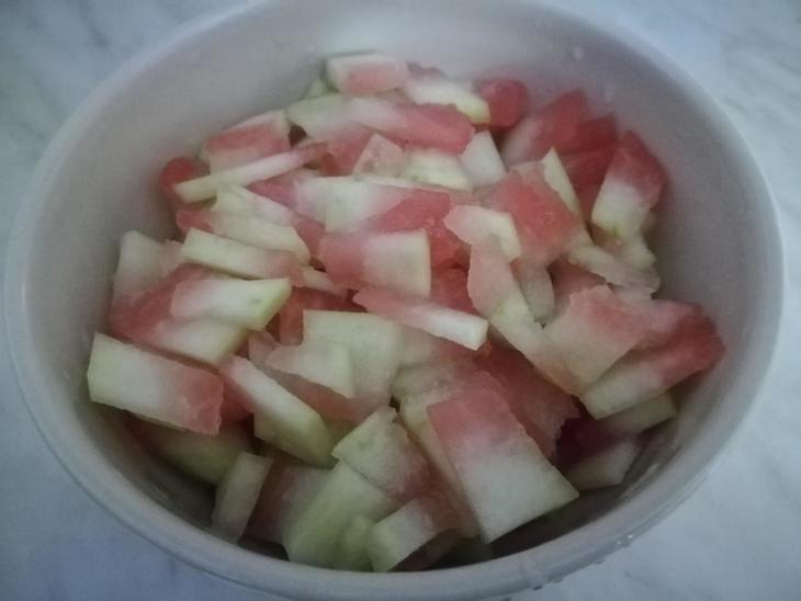 こちらはスイカの皮を朝漬けしたもの、おつまみにはこれだけでも美味しいですよ!(お醤油や昆布と和えてもいいですね!)
