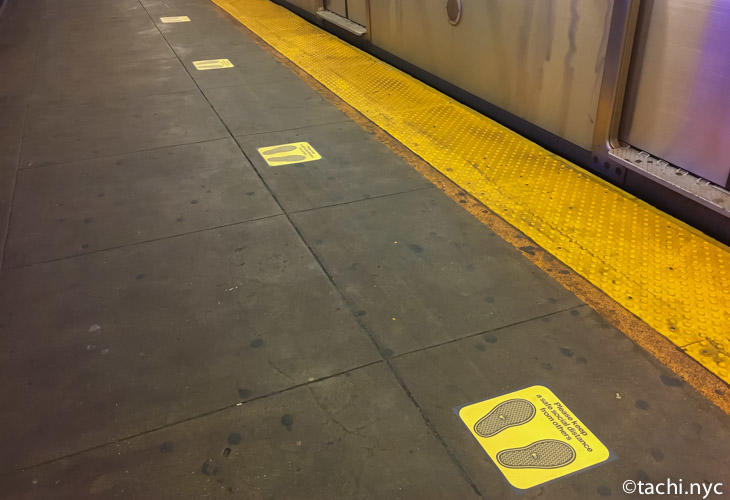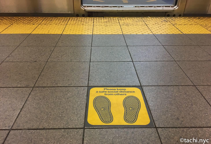 ホームには、ソーシャル・ディスタンスを守るように、立ち位置がマークされています。他人と6フィート(約1.8m)の距離を保たなければなりません。