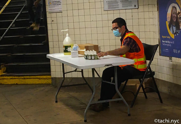 公共交通機関は、手すりや構内入口のハンドルバーなど、他人と共有して触るものがたくさんありますね。そこで、手を消毒できるようハンドサニタイザーが置いてあります。この”NYS Clean”というハンドサニタイザーは、ニューヨーク製。ボトルへの詰め替えとパッキングのみ受刑者が行っているといわれています。MTA(地下鉄、バスなど)や学校、政府関係用向けに無料使用できるもので、市販はされていません。クオモNY州知事は、2020年3月9日の会見で、「アルコール度が75%と高く、ライラック、アジサイ、チューリップのようなフローラルの香りがする」といち押ししていたもの。