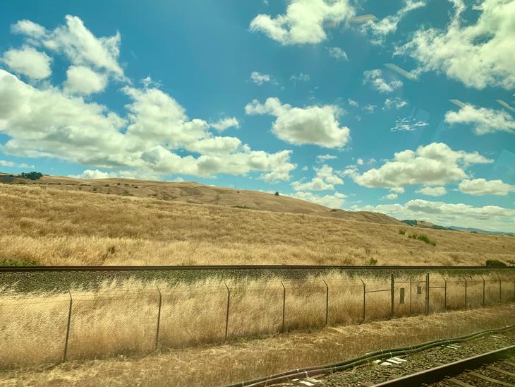 ヘイワード駅を過ぎてると、草地は乾季の風景"ゴールドフィールド(Gold Field)"と表現する事がありますがそんな景色。空が広く雲も三次元的に見えはじめカリフォルニアらしい風景ですね。