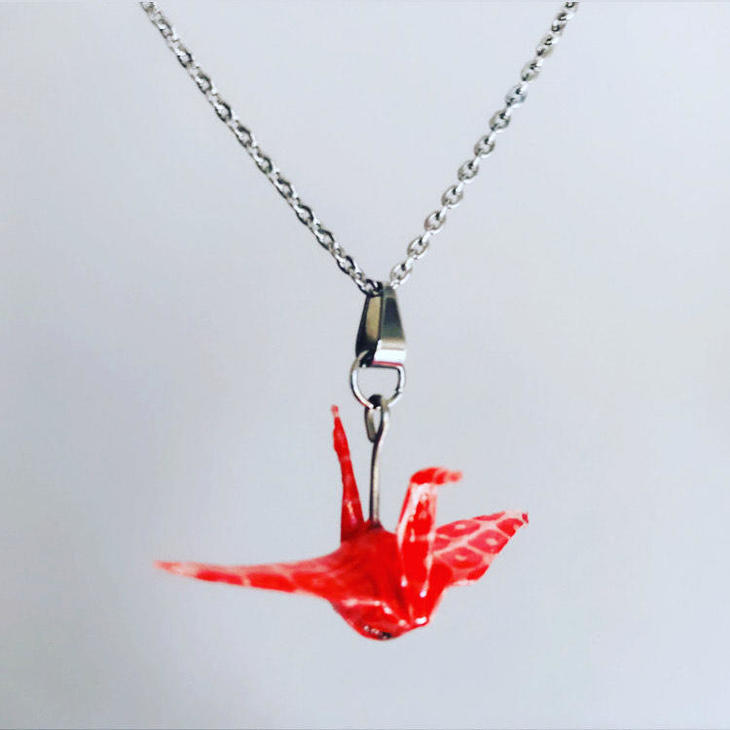 それが高じて KAMI という名前で折り紙とアクセサリーをミックスした作品と商品を販売しています。折り紙のところはコーティングされ、きれいにアクセサリーになりますし、ピアスやネックレスなどかわいいです。
