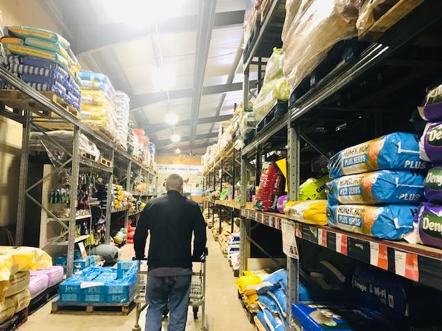 ▲ 広い店内に山積みの飼料。この日は鶏用を購入