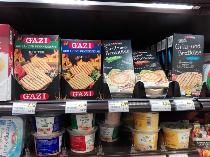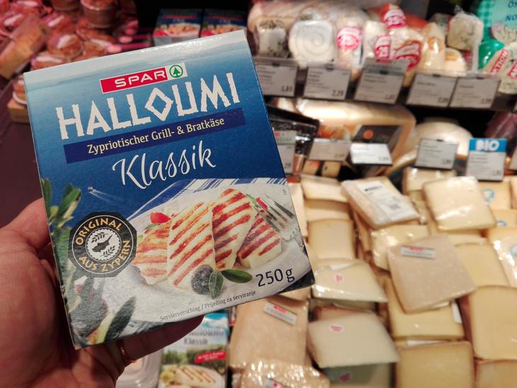 こちらはHalloumi(ハルーミ)というチーズ。中東でよく食べられている塩気のあるハルーミは、ゴムのように弾力があるのが特徴で、噛むと口の中でキュッキュッといった音がするのが楽しいチーズ。溶けないチーズなのでグリルするのに最適で、バーベキューにも大人気です。