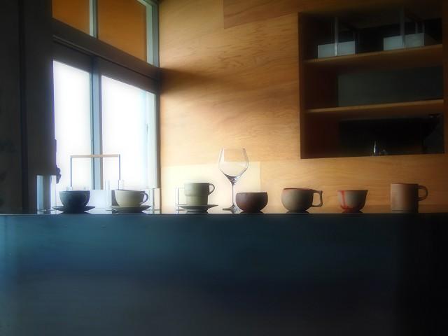 店内には備前焼のカップやグラスが整然と並んでいます。