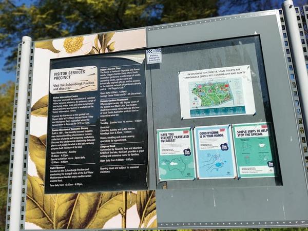 アデレード植物公園内の掲示板には、手洗いの徹底などのアドバイスが(写真右側)。