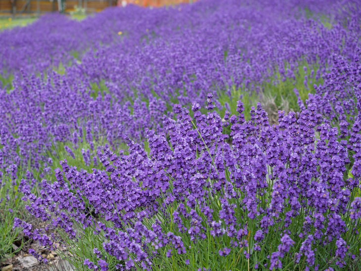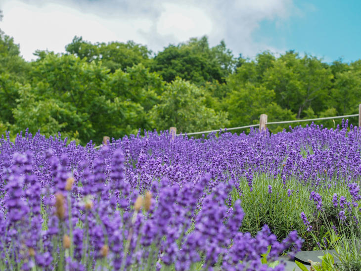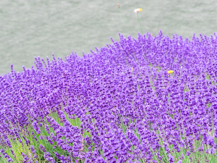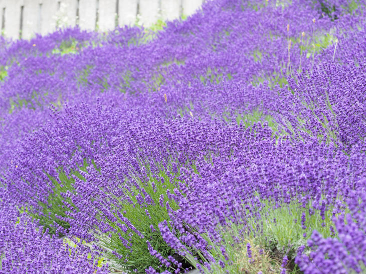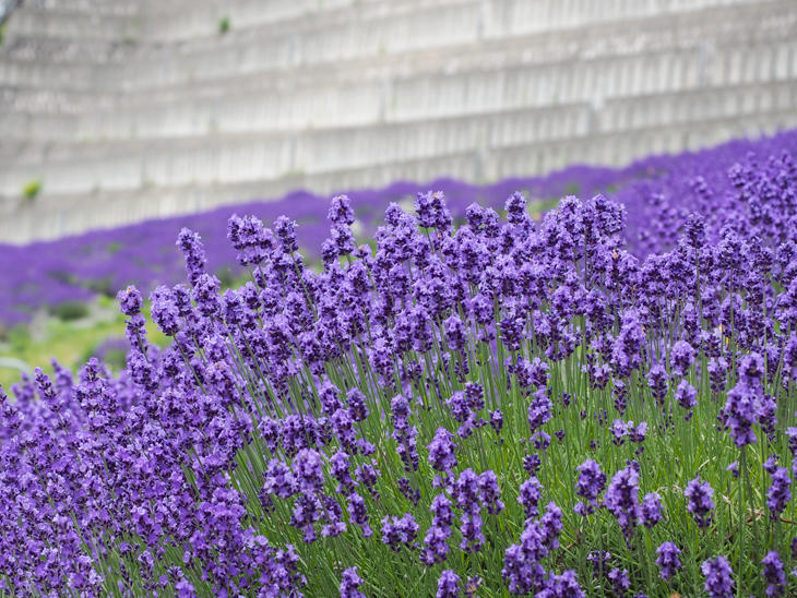 斜面の一画に植えられたラベンダーが扇状に咲いています。
