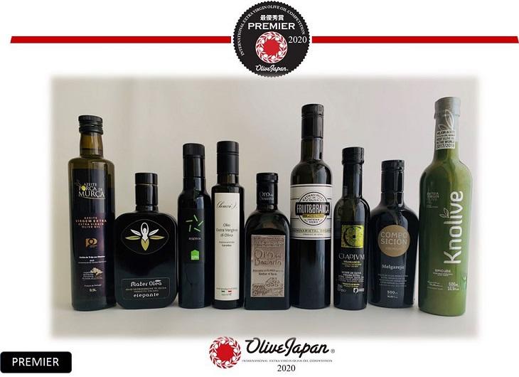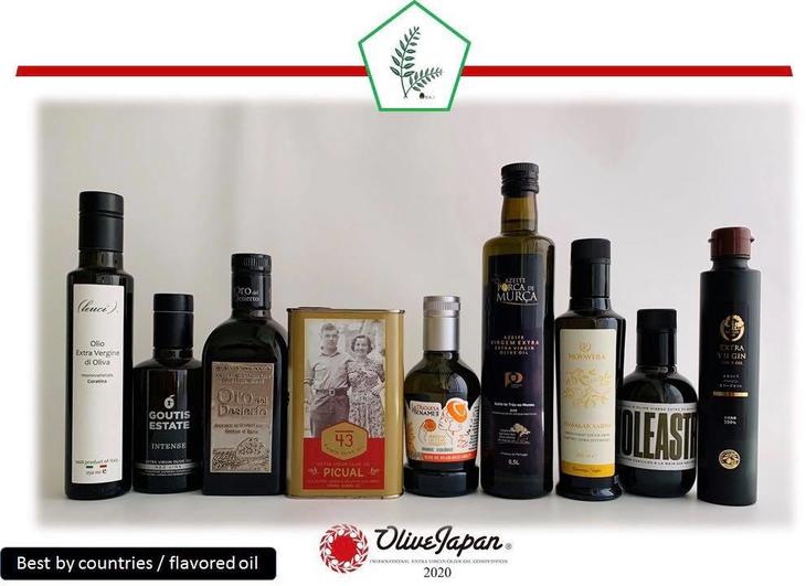 もちろん、スペインに限らず、ほかの国の受賞オイルも並んでいます。こちらの写真は、各国のNo.1に選ばれたオリーブオイルと今回全体のNo.1に選ばれたフレーバードオリーブオイルです。