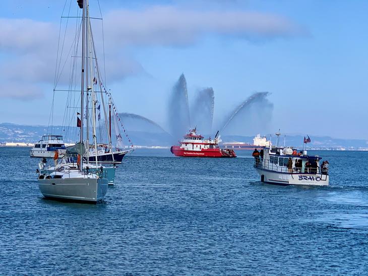 停泊中のクルーザーの間から消防艇が現れ、開幕のお祝いの放水です。