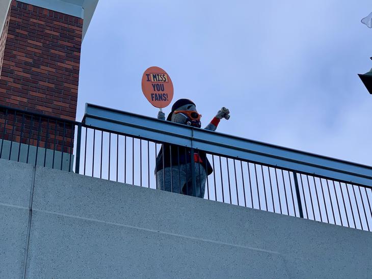 マスコットのシールズ君もマスク着用でマッコビーコーブのファンに"I miss you Fans!"のサイン