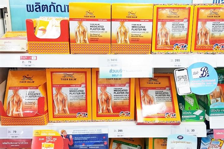 湿布タイプの製品はシンガポール製。タイ・バンコクにある薬局で大々的に販売されているので、長い間、タイ製と思っていましたが、そのためか、少し割高な感じもしますが、貼っているだけで効果が感じられそうなので、わが家では一番よく購入して、使っている商品です。スポーツをしたあとや重い荷物を持ったあとなど、筋肉痛が感じられたり、心配になった身体部位に貼って使っています。サイズは一番小さいもので、7×10cm(湿布2枚入り)~あります。私は今回10×14cm(2枚入り)を、日系のフジスーパーのレジ近くの薬局で、約79バーツ購入しました。(上から2番目と3番目の写真は、後日7月30日に、Bootsという薬局(ドラッグストア)で撮影したものです)。