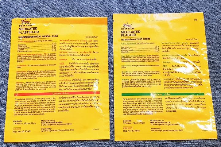タイガーバームの湿布には2種類あり、どちらも「筋肉痛を和らげるためのもの」と記載されています。日本では、一般的にはスポーツ後、打撲や捻挫直後等、患部が腫れて熱を持っている状態であれば「冷湿布」、慢性的な肩こり等であれば「温湿布」を選ぶと言われているようですが、自分が気持ちよいと思うほうを選ぶとよいと解説する医師もいるようです(タイの薬局で、これらの使い分けについて、薬剤師さんも含め、数人に聞いてみましたが、期待したような解説は今のところ得られませんでした)。