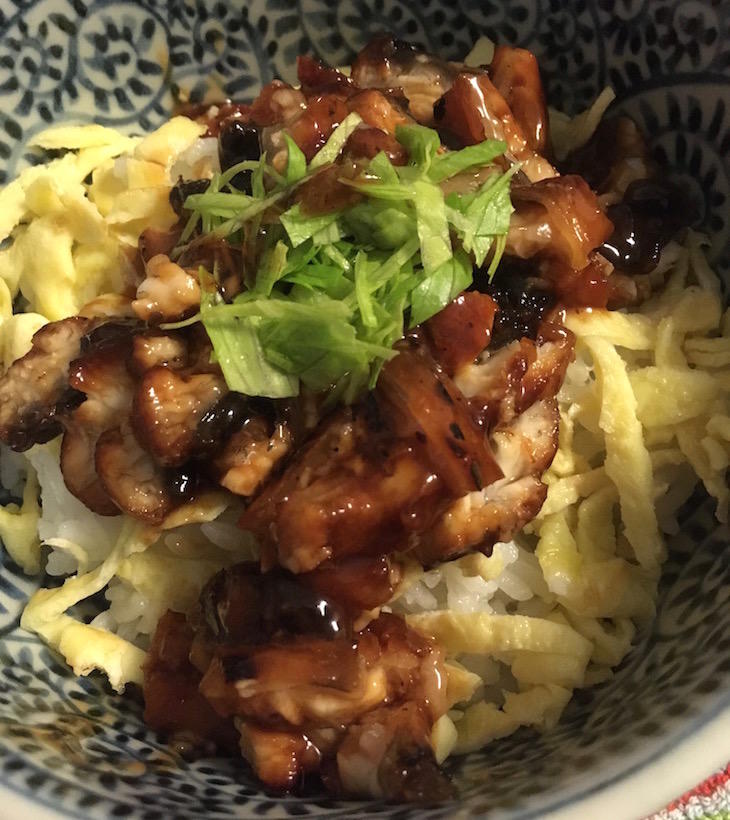 2回目は、ひつまぶし風に、うなぎを刻んでいます。ごはんの上には錦糸卵、うなぎの刻んだもの、トッピングは三つ葉ではなく、レタスです(笑)。レタスをトッピングするあたりがアメリカですね。三つ葉はお高いですし、グリーンの彩りがあればいいので問題ありません。うな丼もいいのですが、個人的にはひつまぶし風が好き。