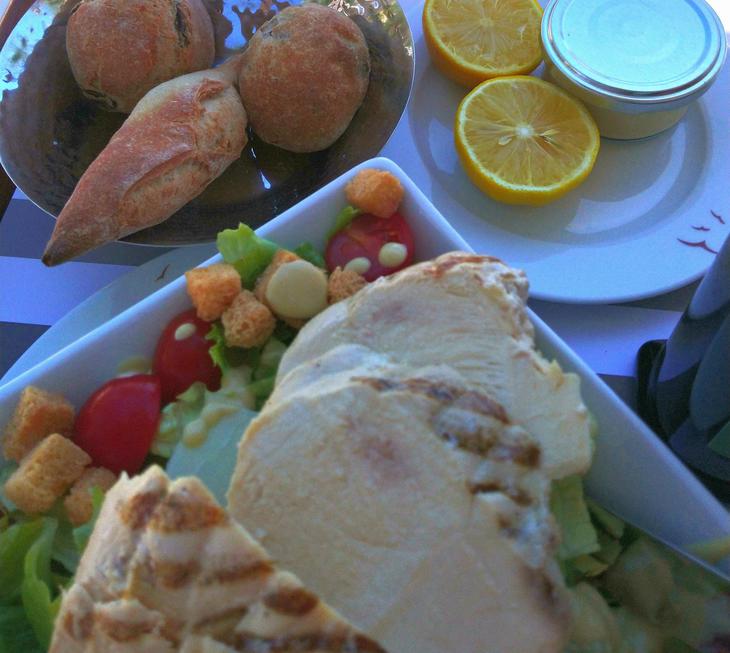 到着してビーチチェアに座ると絶妙なタイミングでスタッフが飲み物などのオーダーを取りに来るので、座っているだけで至れり尽くせりのサービス。ランチがまだだった私は飲み物と軽くサラダをオーダー。スタッフが運んでくださるのでパラソルの下でゆったりいただきました。