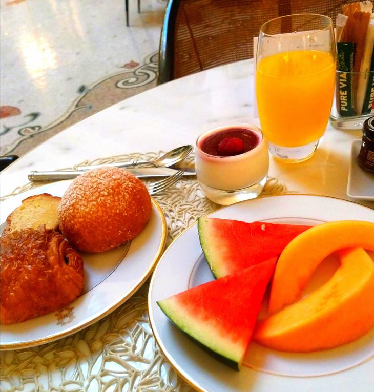 この日の私はパン・オ・ショコラなどのほか、フレッシュなフルーツがおいしそうだったのでスイカとメロンをいただきました。甘くておいしかったです。