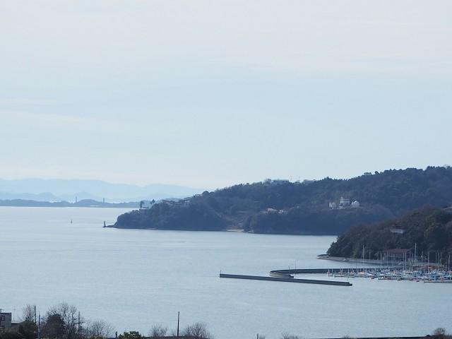 右に目を移すと前回紹介した「蓬崎」の岬が見えます。岬の先端からチョコっと見えるのが灯台です。さらにその奥の煙突が見える島が犬島で、ここは高い煙突を持つ銅の製錬所跡が島のシンボルとなっていて、遠くからもかすかに望めます。