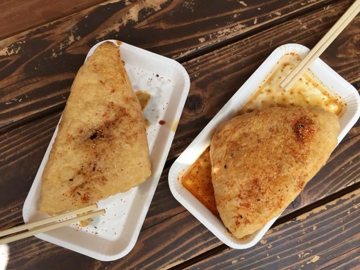 手のひらサイズのあぶらあげが、1個130円。真ん中に穴をあけて、しょうゆと七味をかけていただきます。
