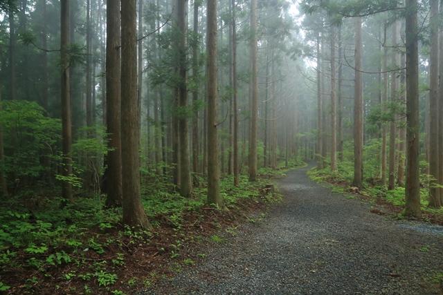 不動尊を過ぎ、霧に包まれる杉の参道を戻ります。