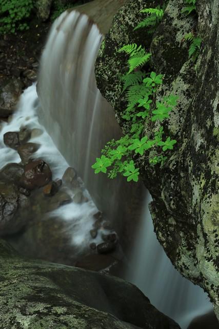 岩に沿って扇状に流れ落ちる様子が特徴的な渓谷のメインスポットです。