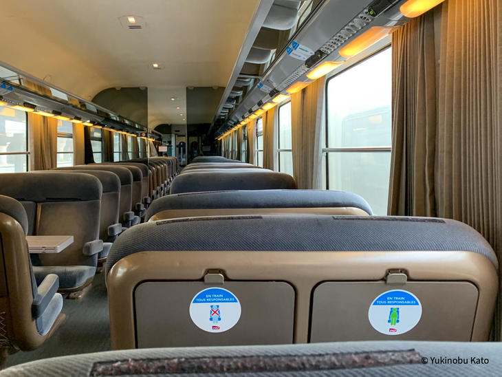 ▲パリからオルレアンに向かう列車内、各座席にはソーシャルディスタンスのため「座れる席」と「空ける席」のマークが