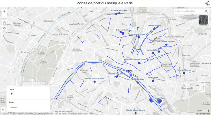 ▲マスク着用が義務化されるエリア(パリ市ウェブサイトより)