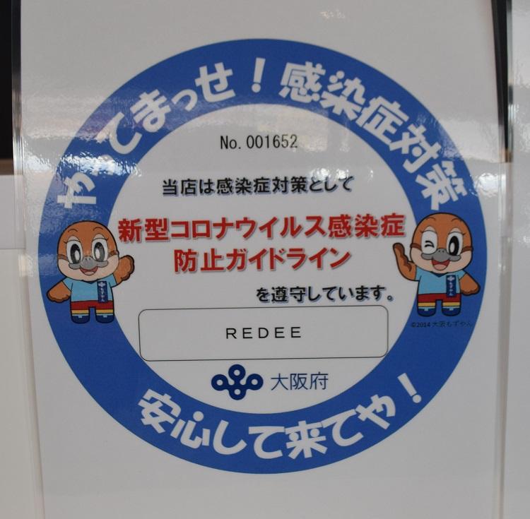 こんにちは。大阪特派員のかおりです。大阪は猛暑です。筆者は島根、埼玉、徳島に住んだことがありますが、大阪の夏がいちばん暑いです。お越しの際は、熱中症対策をしっかりとお願いします。天気が不安定で晴れの予報でも一時的に雨が降ることがありますので、晴雨兼用折り畳み傘の持参をおすすめします。新型コロナウイルスの大阪の感染者数は連日100〜200人台となっています。感染予防はしっかりしないといけませんが、お出かけも少しはしたい……できれば安心して過ごせる場所を選びたいですよね。2020年7月1日から大阪府では、飲食店や遊行施設などが新型コロナウイルスの感染防止策に取り組んでいることを示す、感染防止宣言ステッカーを発行しています。写真のステッカーは吹田市にあるREDEEというeスポーツ施設に貼ってあったものです。