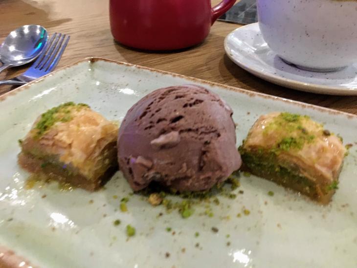 その味の確かさに、この夜はすっかり「トルコの伝統」がテーマになってしまい、デザートにはもちろん、Baklava(£5.95)というくるみとハチミツシロップの「伝統的な」パイ包みをチョイス。焼き菓子そのものもさながら、添えられたチョコレートアイスも、中になにやら不思議なザクザクとした食感のいいものが混ぜられており、とてもおいしかったです。