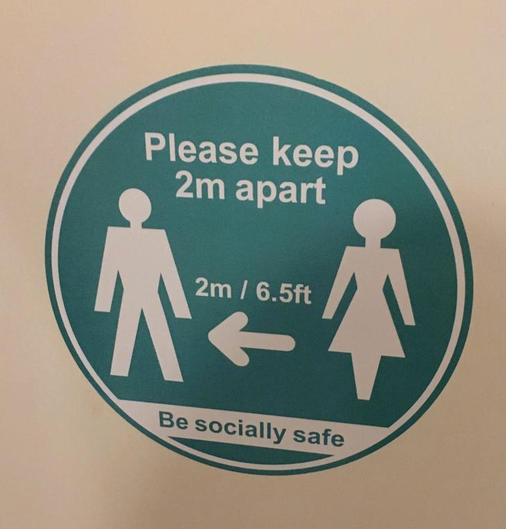 今回の飲食店支援キャンペーンでは、新型コロナウイルス感染拡大を防ぐための対策も、義務づけられています。「The Bridge」でも入店して正面に消毒用ジェルが置かれ、床には一方通行を表すテープが、壁には社会的距離(ソーシャル・ディスタンス)をとるステッカーがあちこちに貼られていました。利用客が去ったあとは即座に消毒液で座席などを拭いており、支払いはカード払いを推奨していました。