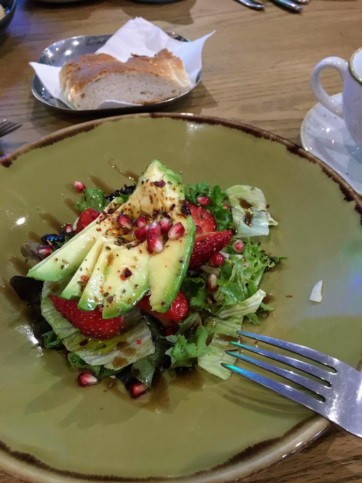 ベジタリアンメニューにも、Guvecという見知らぬ名前のポット料理があり、「伝統的なトルコのキャセロール(蒸し鍋焼き料理)」(£14.95)とあったので、それとアボカドとイチゴのサラダ(£5.5)といういかにも写真映えしそうなサラダを前菜として頼みました。