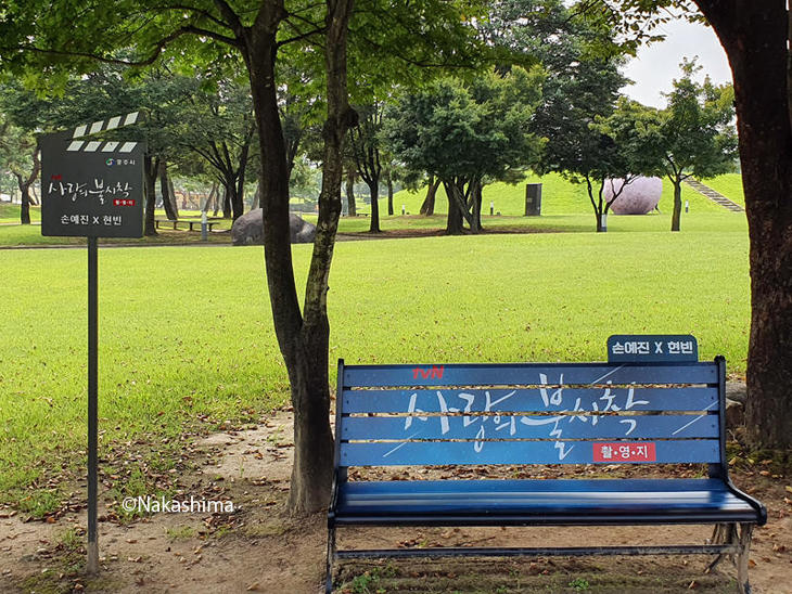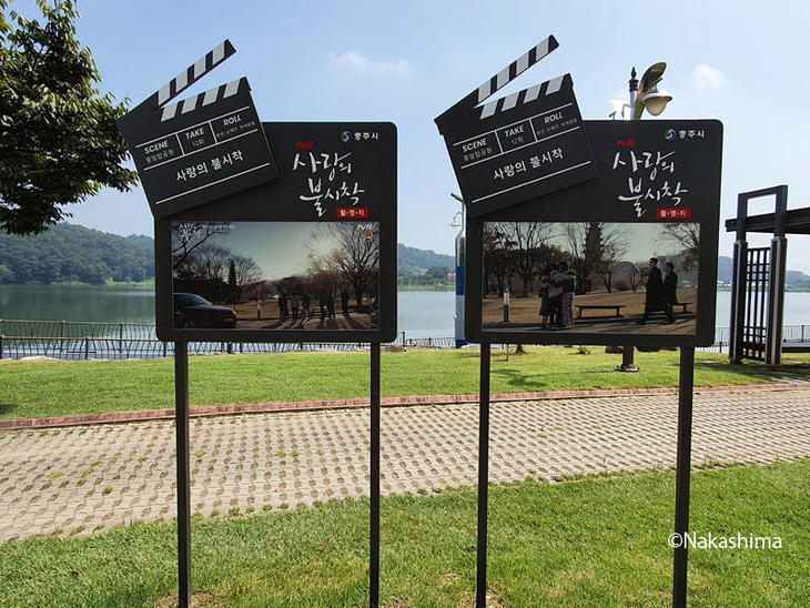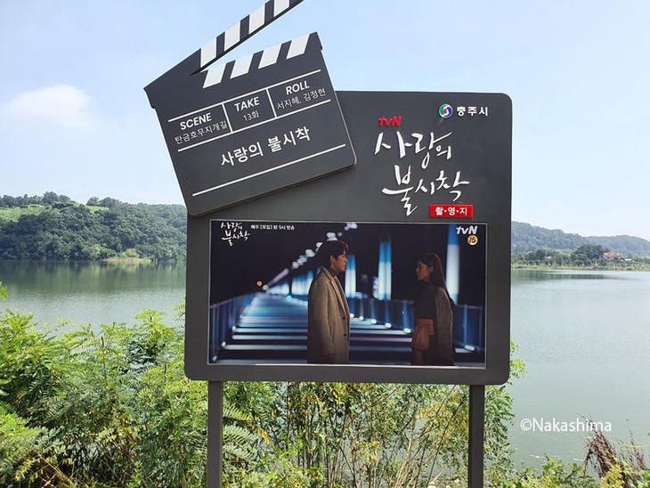 同じ忠州市中央塔史跡公園には、13話でク・スンジュンがリ・ジョンヒョクの韓国への密入国を手助けしたことがソ・ダンにばれて説明するシーンと、14話の二人のキスシーンが撮影された弾琴湖ムジゲキル(虹の道)があります。