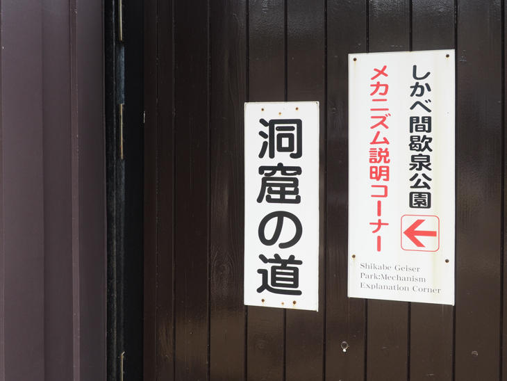 「洞窟の道」を指す矢印の方向へ行くと建物1階にパネルなどで「間歇泉」を解説しており、温泉やマグマの仕組みがわかります。こちらのコーナーと行き来しながら、「間歇泉」を複数回見て堪能。