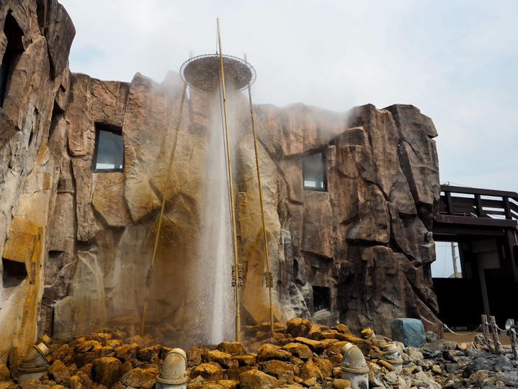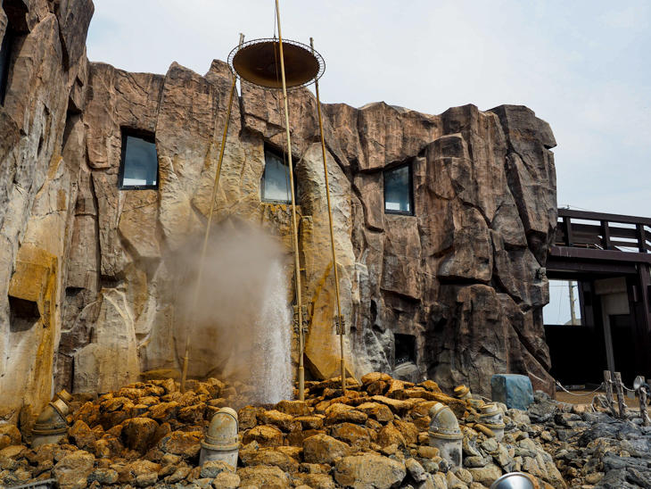 温泉を掘っているときに偶然発見されたという「間欠泉」は、約10分ごとに地下から吹き上がる温泉水が高さ15mにまで達するそう。