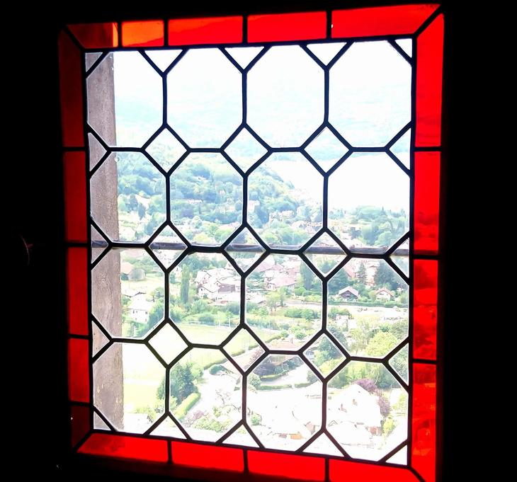 フランス東部オート=サヴォア県アヌシー湖を臨む地にそびえ建つ古城です。アヌシー湖を横目に見ながら城に向かいます。森に囲まれた道を進むと城が見えてきました。