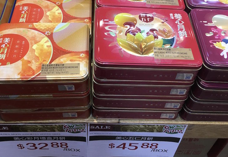 月餅が詰まったボックスは、1箱だいたい$50ほど。私は買ったことがありませんが、中国系の人々が買っているのは見たことがあります。