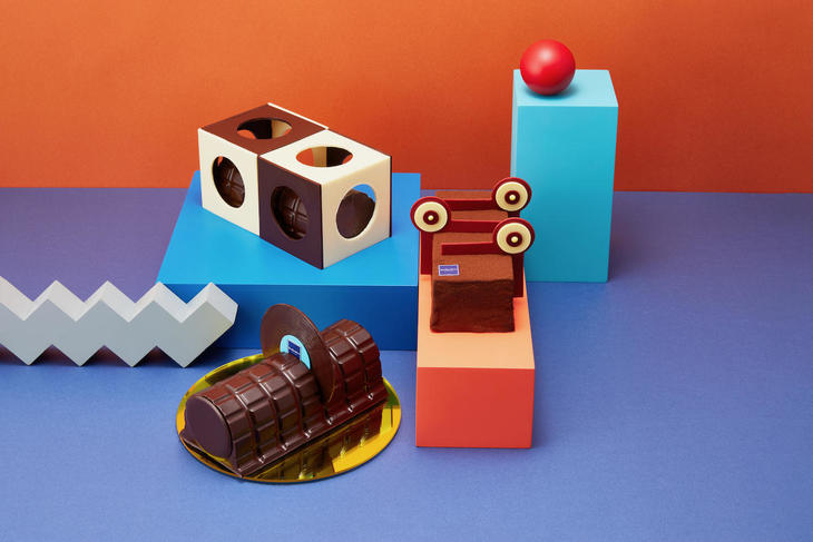 錯覚の効果で私たちを楽しませるオプアートから着想を得て、幾何学的デザインと独創的な味わいに仕上げられています。直方体のデコール、タブレットを模したチョコレートの下には、華やかな味わいのガトーが隠れています。 エクアドル産カカオのチョコレートムースとマンゴーのクレームブリュレ、ふわりとベルガモットの風味が広がるビスキュイショコラの組み合わせです。