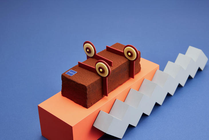 的(まと)のようなヘッドライトをつけた車が描かれた強烈でポップなポスター。このデザインをもとに作り出された冷凍配送のガトーです。ペルー産カカオを使用した濃厚なチョコレートムースにパッションフルーツ風味のガ ナッシュとビスキュイショコラ、さくさくとしたミルクチョコレートとヘーゼルナッツのサブレが合わさっています。繊細で調和のとれた味わいです。