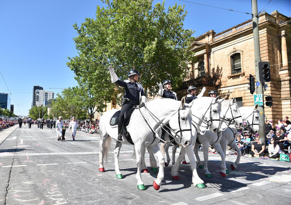 白馬に乗ったお巡りさんも毎年恒例、今年は見られるかどうかまだわかりません(2018年パレードより)