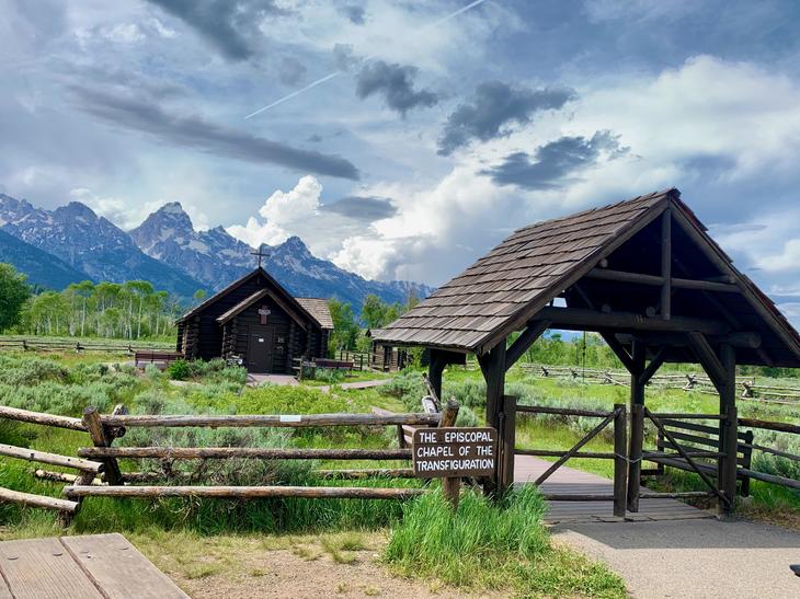 大草原のなかにたたずむ礼拝堂が「トランスフィギュレーション礼拝堂(Chapel of the Transfiguration)」コロナで中には入れませんでしたが、反対側にある大きな窓からはグランドティトンの山々が見えるそうです。草原に少し残る枯れかけた緑色、アスペンの燃えるような黄色に淡いグレーの岩肌……ここも見逃せないポイントかもしれません。