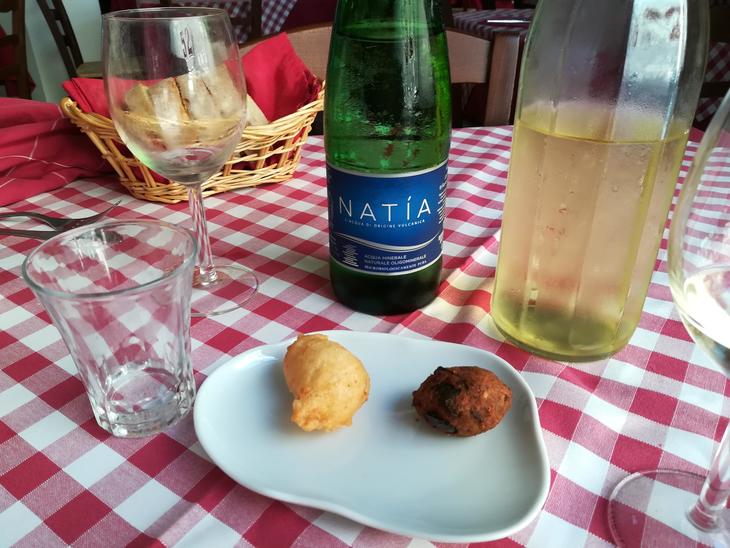 こちらがトラットリア52です。白ワインと、食べてみたかったナスのコロッケ Polpette di Melanzaneやパスタクレシュータがきました。