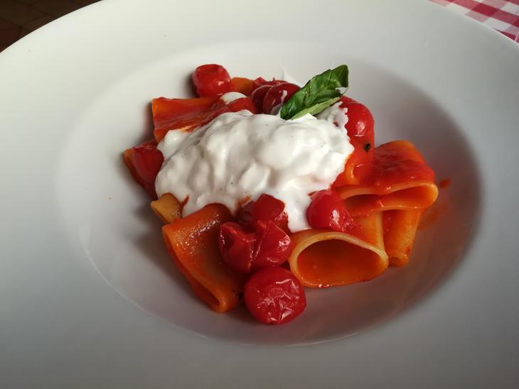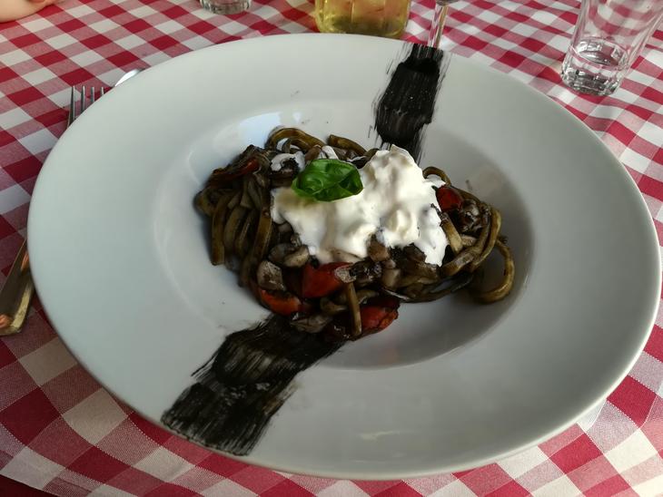筆者が選んだプリモピアットはイカスミとプチトマト入りチーズがたっぷりのパスタScialatielli al nero di seppia e stracciata di bufala を!