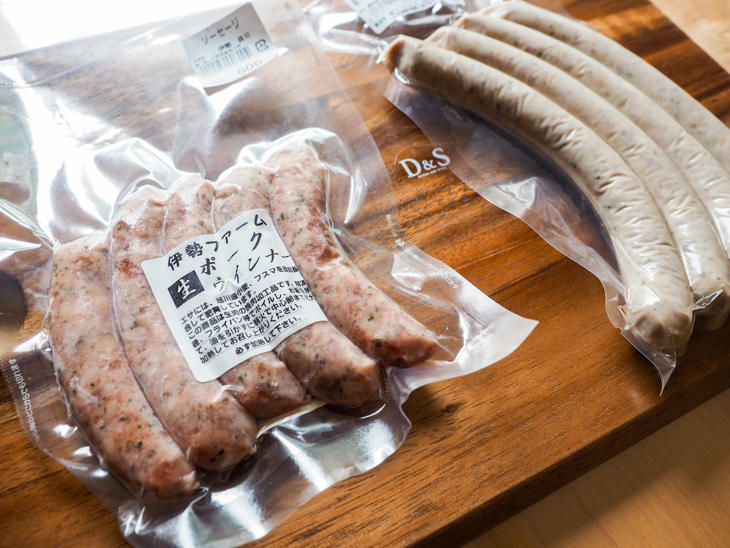 写真左が「あさがお」で購入した旭川・江丹別町産「生ポークウィンナー」(伊勢ファーム)。右は旭川までの道すがら、新十津川町で購入した「ドイツ風焼くソーセージBBQサイズ」(ヴルストよしだ)。