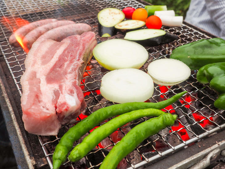 地元産の野菜と肉で、ちょっぴり涼しくなってきた空の下、炭火のぬくもりを楽しみながらBBQ。