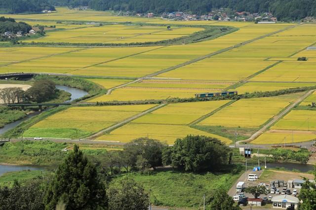 高台から見下ろす田園風景とJR水郡線のコラボが人気のスポットです。
